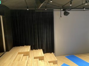 客席側壁カーテン取付、壁全面にスライド可能形式です。