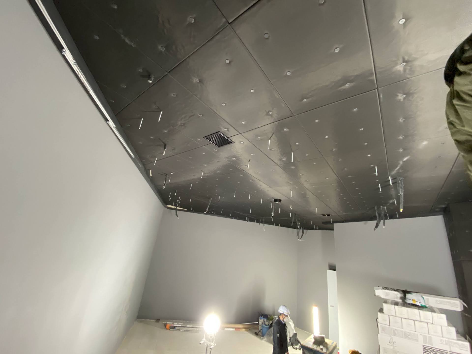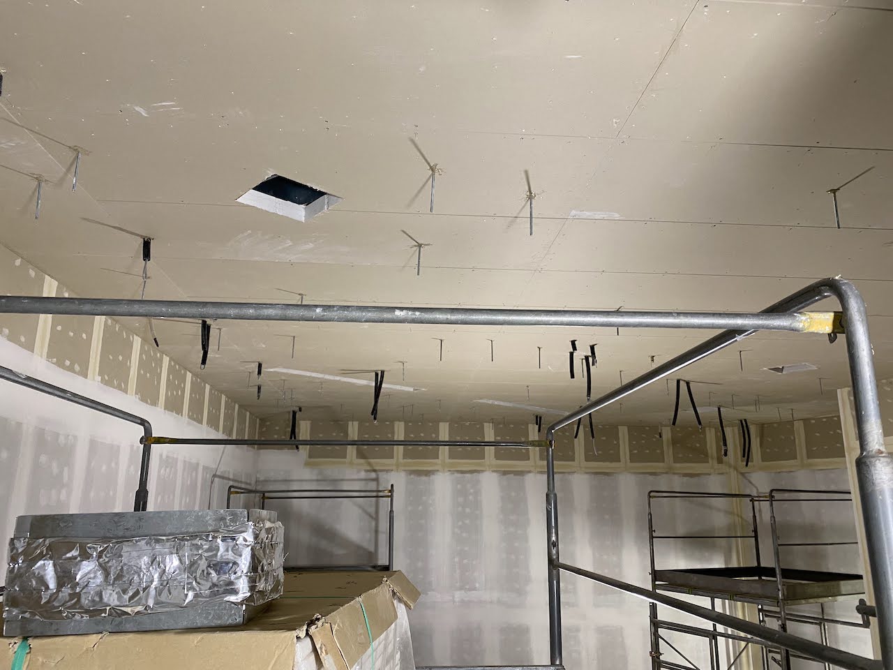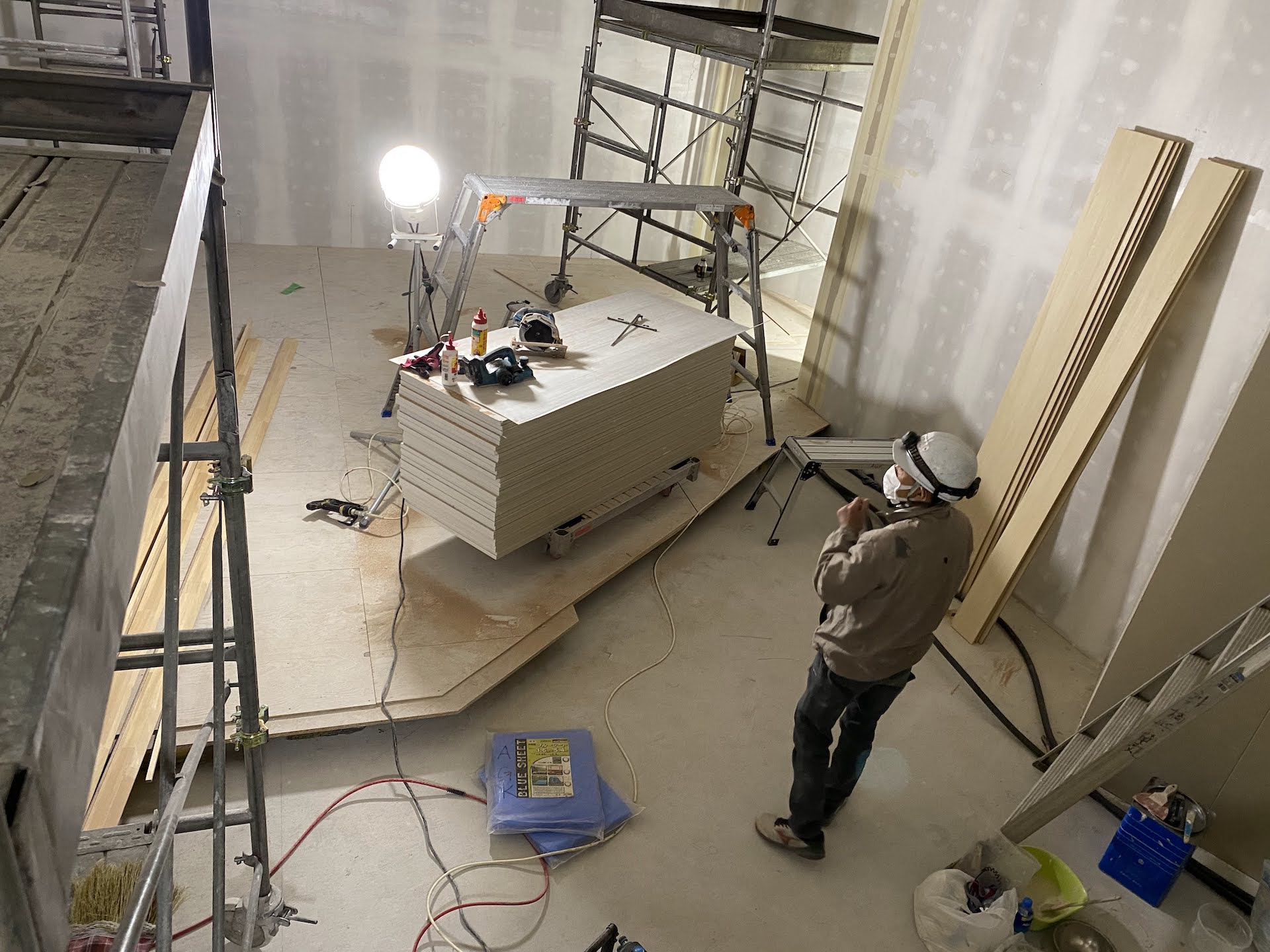 壁ボード貼り完了、天井は黒の吸音グラスウール貼り