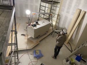 天井ボード貼り完了。浮床構造です。壁は下地材。