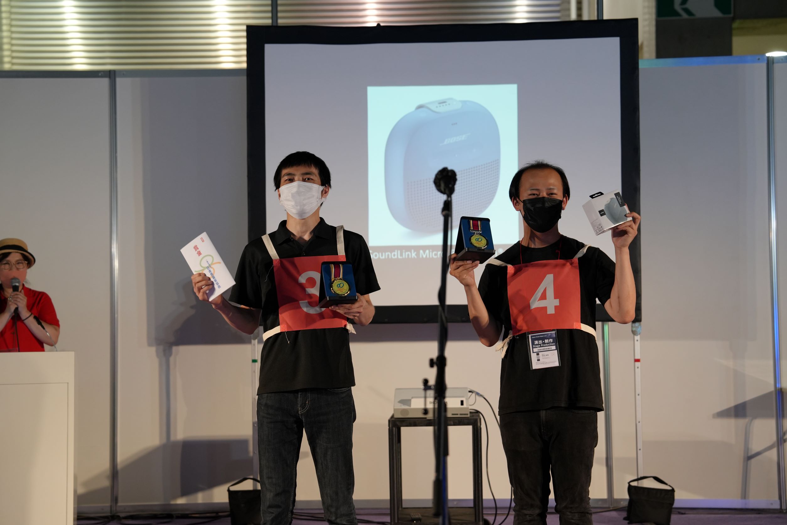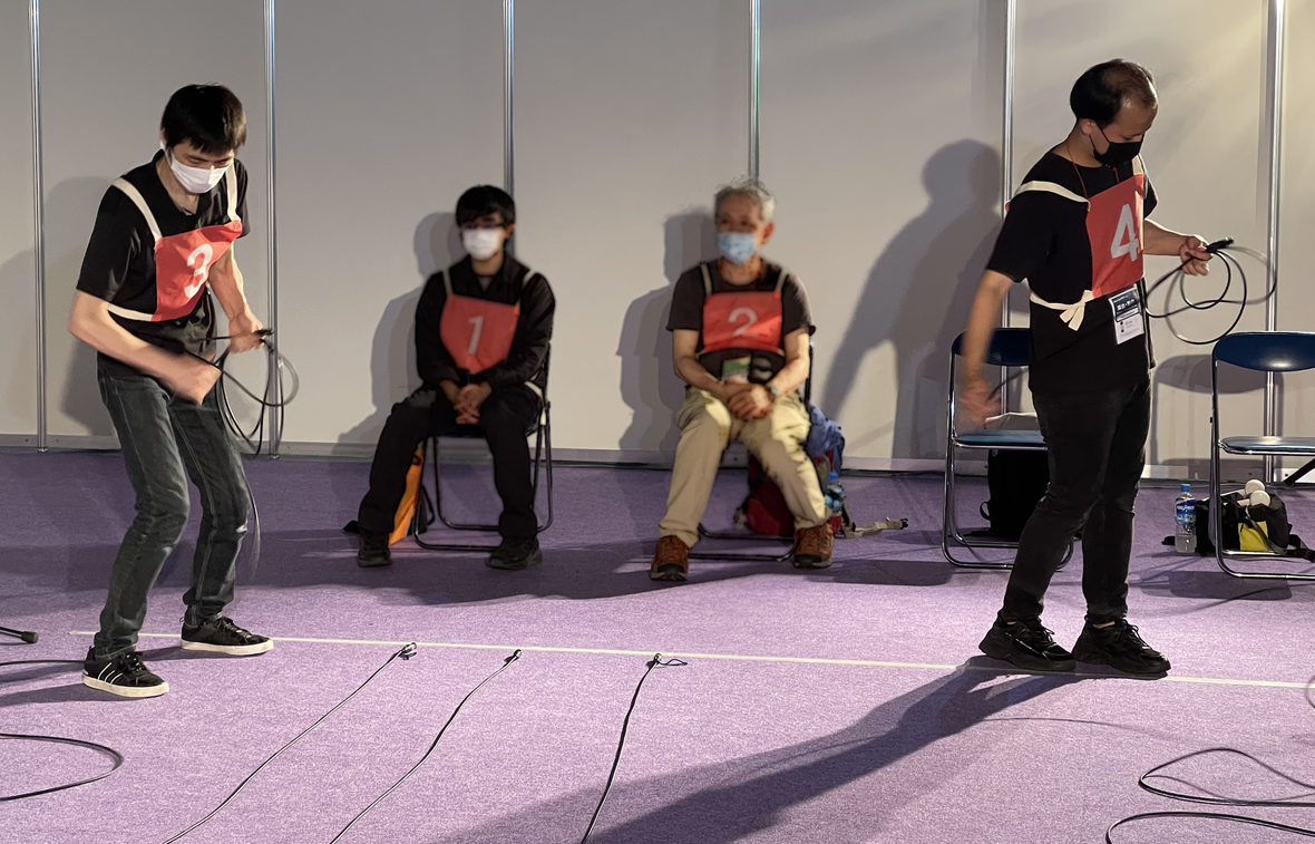 2022.10.07 8の字巻きグランプリ 音響担当者にとってはケーブルの片付けは当たり前のことですが、これを競技にしてイベントを毎年実施しています。 日本音響家協会が企業より協賛をして、優勝者には金メダルと副賞10万円が渡されます。 競技は10メートルのマイクケーブルをいかに早く、綺麗に巻けるか、です。 みなさんプロの方達ばかりですので、早い、綺麗です。 こんな格好でケーブルを巻いていきます。 優勝者と準優勝者です。手に持っているのは10万円です。 現場担当の音響屋さんだから、早く綺麗にケーブルを巻くことが出来ます。 凄く早いです。