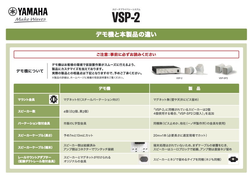 ヤマハのスピーチプライバシーVSP-2製品と、VSP-2デモ機の違いは次のとおりです。(ヤマハのVSP-2デモ機資料より)